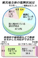 阪神・淡路大震災から十年を前に、神戸新聞社は、定点調査を続けている神戸市内の激甚被災地二地区の計千世帯を対象に、「震災十年・被災者追跡アンケート」を実施した。その結果、被災地全体の復興状況について、47%が「取り残されている部分がある」と答え、16%が「遅れている」と回答。大半の被災者が、復興はまだ途上と感じていることが明らかになった。